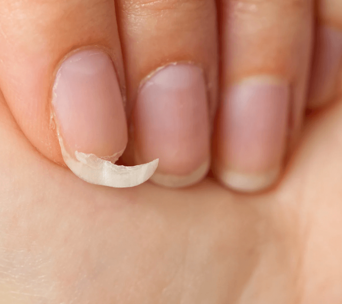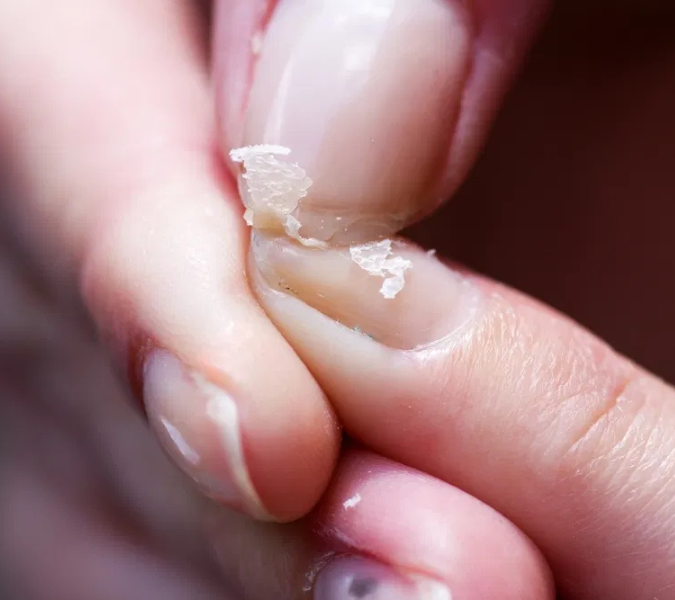 Нокти, които са груби, дехидратирани и изтънели след отстраняване на изкуствено покритие.